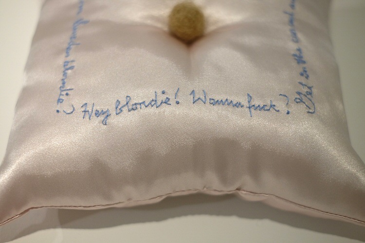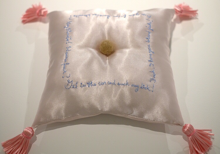 Tagged 3D, blond, cat call, embroidery, entitlement, feminism, satin, sculpture, soft sculpture, text, untreated human hair, whiteness